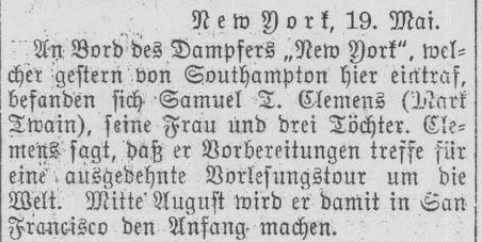 | An Bord des Dampfers „New York“, welcher gestern von Southampton hier eintraf, befanden sich Samuel T. Clemens [sic] (Mark Twain), seine Frau und drei Töchter. Clemens sagt, daß er Vorbereitungen treffe für eine ausgedehnte Vorlesungstour um die Welt. Mitte August wird er damit in San Francisco den Anfang machen. | On board the steamer “New York”, which arrived here yesterday from Southampton, travelled Samuel T. Clemens [sic] (Mark Twain), his wife and three daughters. Clemens says he is making preparations for an extended lecture tour around the world. The tour will commence in San Francisco in mid-August. |