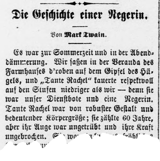 Es war zur Sommerzeit und in der Abenddämmerung. Wir saßen in der Veranda des Farmhauses d'roben auf dem Gipfel des Hügels, und „Tante Rachel“ kauerte respektvoll auf den Stufen niedriger als wir denn sie war unser Dienstbote und eine Negerin. Tante Rachel war von robuster Gestalt und bedeutender Körpergröße; sie zählte 60 Jahre, aber ihr Auge war ungetrübt und ihre Kraft ungebrochen. Sie war ein lustiges, fröhliches Gemüth, und das Lachen wurde ihr nicht schwerer, als einem Vogel das Singen. Sie stand wie üblich, wenn der Tag zu Ende ging, eben jetzt wieder im Feuer das heißt, sie wurde erbarmungslos geneckt und amüsirte sich darüber. Dabei ließ sie ein schallendes Gelächter nach dem anderen ertönen, und dann saß sie wieder, das Gesicht mit den Händen bedeckend, da u. schien über den Genuß förmlich in Verzückung zu gerathen, die auszudrücken es ihr an Athem gebrach. In einem solchen Augenblicke kam mir plötzlich ein Gedanke, und ich fragte sie: It was summer-time, and twilight. We were sitting on the porch of the farmhouse, on the summit of the hill, and “Aunt Rachel” was sitting respectfully below our level, on the steps - for she was our Servant, and colored. She was of mighty frame and stature; she was sixty years old, but her eye was undimmed and her strength unabated. She was a cheerful, hearty soul, and it was no more trouble for her to laugh than it is for a bird to sing. She was under fire now, as usual when the day was done. That is to say, she was being chaffed without mercy, and was enjoying it. She would let off peal after peal of laughter, and then sit with her face in her hands and shake with throes of enjoyment which she could no longer get breath enough to express. At such a moment as this a thought occurred to me, and I said: