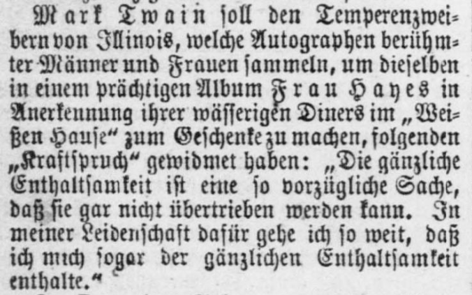 Mark Twain soll den Temperenzweibern von Illinois, welche Autographen berühmter Männer und Frauen sammeln, um dieselben in einem prächtigen Album Frau Hayes in Anerkennung ihrer wässerigen Diners im „Weißen Hause“ zum Geschenke zu machen, folgenden „Kraftspruch“ gewidmet haben: „Die gänzliche Enthaltsamkeit ist eine so vorzügliche Sache, daß sie gar nicht übertrieben werden kann. In meiner Leidenschaft dafür gehe ich so weit, daß ich mich sogar der gänzlichen Enthaltsamkeit enthalte.“ The Temperance Women of Illinois, who collect autographs of famous men and women in order to present them in the form of a magnificent album to Mrs. Hayes in appreciation of her watery dinners in the “White House”, have received the following words by Mark Twain as his contribution to the endeavour: “Total abstinence is so excellent a thing that it cannot be taken too far. In my passion for it I go so far that I even abstain from total abstinence.”