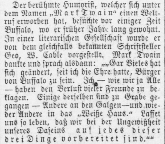 | Der berühmte Humorist, welcher sich unter dem Namen „Mark Twain“ einen Weltruf erworben hat, besuchte vor einiger Zeit Buffalo, wo er früher Jahre lang gewohnt. In einer literarischen Gesellschaft wurde er von dem gleichfalls bekannten Schriftsteller Geo. W. Cable vorgestellt. Mark Twain dankte und sprach alsdann: „„Gar Vieles hat sich geändert, seit ich die Ehre hatte, Bürger von Buffalo zu sein. Ich - wie wir ja Alle - haben den Verlust vieler Freunde zu beklagen. Einige derselben sind zu Grabe gegangen Andere an den Galgen - und wieder Andere in das „Weiße Haus.“ Lasset uns so leben, daß wir bei der Ungewißheit unseres Daseins auf jedes dieser drei Dinge vorbereitet find.““ | The famous humorist, who gained worldwide renown under the name “Mark Twain”, visited Buffalo some time ago, where he had lived for many years in the past. At a literary society he was introduced by the equally famous writer Geo. W. Cable, also a well-known writer. Mark Twain thanked him and then said: ““Many things have changed since I had the honor of being a citizen of Buffalo. I - like all of us - have mourned the loss of many friends. Some have gone to their graves, others to the gallows, and still others to the White House. Let us live so that in the uncertainty of our existence we may be prepared for each of these three cases.”” |