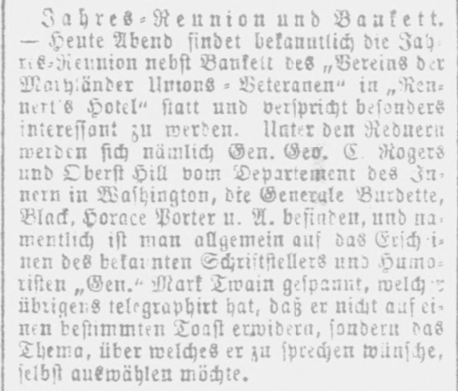 | Heute Abend findet bekanntlich die Jahres-Reunion nebst Bankett des „Vereins der Maryländer Unions-Veteranen“ in „Rennert's Hotel“ statt und verspricht besonders interessant zu werden. Unter den Rednern werden sich nämlich Gen. Geo. C. Rogers und Oberst Hill vom Departement des Innern in Washington, die Generäle Burdette, Black, Horace Porter u. A. befinden, und namentlich ist man allgemein auf das Erscheinen des bekannten Schriftstellers und Humoristen „Gen.“ Mark Twain gespannt, welcher übrigens telegraphiert hat, daß er nicht auf einen bestimmten Toast erwidern, sondern das Thema, über welches er zu sprechen wünsche, selbst auswählen möchte. | As you know, the annual reunion and banquet of the “Union Veterans Association of Maryland” will take place tonight at the Hotel Rennert and promises to be particularly interesting. Among the speakers will be Gen. Geo. C. Rogers and Col. Hill of the Department of the Interior in Washington, Generals Burdette, Black, Horace Porter and others; there is a general anticipation of the appearance of the well-known writer and humorist “Gen.” Mark Twain, who, by the way, has telegraphed that he will not reply to any particular toast, but will himself select the subject on which he wishes to speak. |