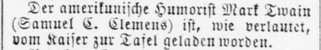 | Der amerikanische Humorist Mark Twain (Samuel C. Clemens [sic]) ist, wie verlautet, vom Kaiser zur Tafel geladen worden. | The American humorist Mark Twain (Samuel C. Clemens [sic]) has reportedly been invited to dinner by the Emperor. |