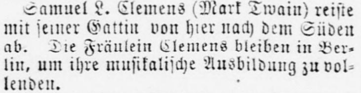 Samuel L. Clemens (Mark Twain) reiste mit seiner Gattin von hier nach dem Süden ab. Die Fräulein Clemens bleiben in Berlin, um ihre musikalische Ausbildung zu vollenden. Samuel L. Clemens (Mark Twain) left for the south with his wife. His daughters stayed in Berlin to complete their musical education.