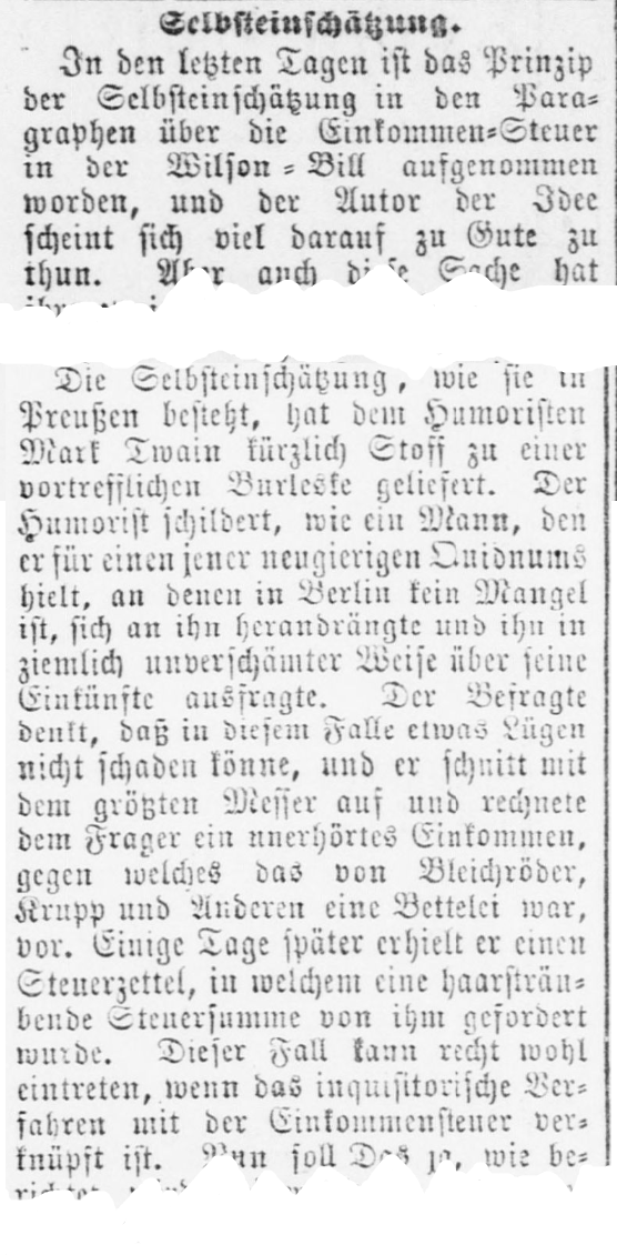 Die Selbsteinschätzung, wie sie in Preußen besteht, hat dem Humoristen Mark Twain kürzlich Stoff zu einer vortrefflichen Burleske geliefert. Der Humorist schildert, wie ein Mann, den er für einen jener neugierigen hielt, an denen in Berlin kein Mangel ist, sich an ihn herandrängte und ihn in ziemlich unverschämter Weise über seine Einkünfte ausfragte. Der Befragte denkt, daß in diesem Falle etwas Lügen nicht schaden könne, und er schnitt mit dem größten Messer auf und rechnete dem Frager ein unerhörtes Einkommen, gegen welches das von Bleichröder, Krupp und Anderen eine Bettelei war, vor. Einige Tage später erhielt er einen Steuerzettel, in welchem eine haarsträubende Steuersumme von ihm gefordert wurde. Dieser Fall kann recht wohl eintreten, wenn das inquisitorische Verfahren mit der Einkommensteuer verknüpft ist. [...] Self-reporting, as it exists in Prussia, has recently provided the humorist Mark Twain with material for an excellent piece. The humorist describes how a man, whom he took to be one of those inquisitive people of whom there is no shortage in Berlin, approached him and questioned him rather impertinently about his income. The interviewee thought that in this case a little lying could do no harm, so he overstated everything massively and calculated an unheard-of income, against which that of Bleichröder, Krupp and others was a beggar's bargain. A few days later Twain received a tax bill demanding a hair-raising amount of tax from him. Such cases may well occur if inquisitorial methods become the standard in income tax calculations. [...]