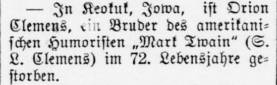 | In Keokuk, lowa, ist Orion Clemens, ein Bruder des amerikanischen Humoristen „Mark Twain“ (S. L. Clemens) im 72. Lebensjahre gestorben. | Orion Clemens, a brother of the American humorist “Mark Twain” (S. L. Clemens) died in Keokuk, lowa, at the age of 72. |