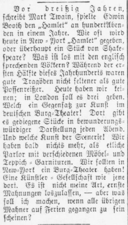 | Vor dreißig Jahren, schreibt Mark Twain, spielte Edwin Booth den „Hamlet“ an hundert Abenden in einem Jahre. Wie oft wird heute in New-York „Hamlet“ gegeben, oder überhaupt ein Stück von Shakespeare? Was ist los mit den englisch sprechenden Völkern? Während der ersten Hälfte dieses Jahrhunderts waren gute Tragöden nicht seltener als gute Possenreißer. Heute haben wir keinen; in London soll es drei geben. Welch ein Gegsatz zur Kunst im deutschen Burg-Theater! Dort gibt es gediegene Stücke in bewunderungswürdiger Darstellung jeden Abend. Und welche Kunst der Scenerie! Wir haben bald nichts mehr, als etliche Parlor mit verschiedenen Möbel- und Teppich-Garnituren. Wir sollten in New-York ein Burg-Theater haben! Eine Künstler-Gesellschaft wie jene dort. Es ist nicht meine Art, ernste Mahnungen loszulassen, - aber was soll ich machen, wenn alle übrigen Mahner auf Ferien gegangen zu sein scheinen? | Thirty years ago, writes Mark Twain, Edwin Booth performed “Hamlet” on one hundred evenings in one year. How often is “Hamlet” performed in New York today, or any play by Shakespeare for that matter? What is wrong with the English-speaking nations? During the first half of this century, good tragedians were not rarer than good comedians. Today we have none; there are said to be three in London. What a contrast to the art of the German Burg Theater! There are dignified plays in admirable performances every evening. And what an art of scenery! We will soon have nothing more than several parlors with various furniture and carpet sets. We should have a Burg Theater in New York! A society of artists like that one. It is not my habit to issue earnest warnings, - but what am I to do when all the other voices of caution seem to have gone on vacation? |