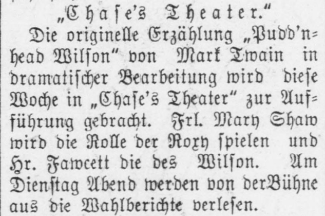 | Die originelle Erzählung „Pudd'nhead Wilson“ von Mark Twain in dramatischer Bearbeitung wird diese Woche in „Chase's Theater“ zur Aufführung gebracht. Frl. Mary Shaw wird die Rolle der Roxy spielen und Hr. Fawcett die des Wilson. Am Dienstag Abend werden von der Bühne aus die Wahlberichte verlesen. | A dramatized version of the unusual story “Pudd'nhead Wilson” by Mark Twain will be performed this week at Chase's Theater. Miss Mary Shaw will play the part of Roxy and Mr. Fawcett that of Wilson. On Tuesday evening the election reports will be read on stage. |