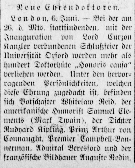 | London, 6. Juni. - Bei der am 26. d. Mts. Stattfindenden, mit der Inauguration von Lord Curzon Kanzler verbundenen Schlußfeier der Universität Oxford werden mehr als hundert Doktorhüte „Honoris causa“ verliehen werden. Unter den hervorragenden Persönlichkeiten, welchen diese Ehrung zugedacht ist, befinde sich Botschafter Whitelaw Reid, der amerikanische Humorist Samuel Clements [sic] (Mark Twain), der Dichter Rudyard Kipling, Prinz Arthur von Connaught, Premier Campbell-Bannerman, Admiral Beresford und der französische Bildhauer Auguste Rodin. | London, June 6. - At the closing ceremony of the University of Oxford, to be held on the 26th of this month, in conjunction with the inauguration of Lord Curzon Chancellor, more than one hundred honorary doctoral degrees will be conferred. Among the distinguished persons to whom this honor is awarded are Ambassador Whitelaw Reid, the American humorist Samuel Clements [sic] (Mark Twain), the poet Rudyard Kipling, Prince Arthur of Connaught, Premier Campbell-Bannerman, Admiral Beresford, and the French sculptor Auguste Rodin. |