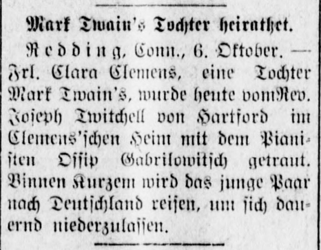 | Frl. Clara Clemens, eine Tochter Mark Twain's, wurde heute vom Rev. Joseph Twitchell von Hartford im Clemens'schen Heim mit dem Pianisten Ossip Gabrilowitsch getraut. Binnen Kurzem wird das junge Paar nach Deutschland reisen, um sich dauernd niederzulassen. | Miss Clara Clemens, daughter of Mark Twain, was married today at the Clemens' home by the Rev. Joseph Twitchell [sic], of Hartford, to the pianist Ossip Gabrilowitsch. Shortly the young couple will depart to Germany to permanently settle down there. |