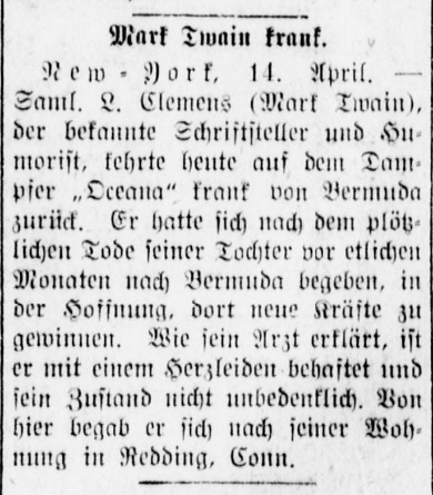 | New-York, 11. April. - Saml. L. Clemens (Mark Twain), der bekannte Schriftsteller und Humorist, kehrte heute ans dem Dampfer „Oceana“ krank von Bermuda zurück. Er hatte sich nach dem plötzlichen Tode seiner Tochter vor etlichen Monaten nach Bermuda begeben, in der Hoffnung, dort neue Kräfte zu gewinnen. Wie sein Arzt erklärt, ist er mit einem Herzleiden behaftet und sein Zustand nicht unbedenklich. Von hier begab er sich nach seiner Wohnung in Redding, Conn. | New York, April 11. - Today, Saml. L. Clemens (Mark Twain), the well-known writer and humorist, returned ill from Bermuda on the steamer “Oceana”. He had traveled to Bermuda after the sudden death of his daughter several months ago in the hope of regaining his strength. As his doctor explains, he has a heart condition and is not in good health. From here he went to his home in Redding, Conn. |