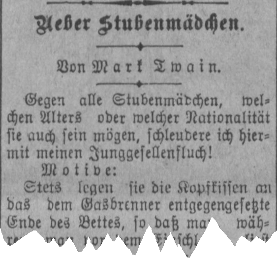 | Wenn ich den gesetzgebenden Körperschaften einen Antrag durchbringen kann, kraft dessen die Stubenmädchen abgeschafft werden, so gedenke ich es zu thun. | ⟪I have cursed them in behalf of outraged bachelordom. They deserve it.⟫ If I can get a bill through the Legislature abolishing chambermaids, I mean to do it. |