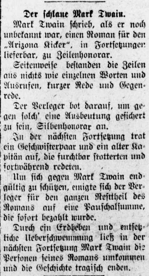 | Mark Twain schrieb, als er noch unbekannt war, einen Roman für den „Arizona Kicker“, in Fortsetzungen lieferbar, zu Zeilenhonorar. | When he was not yet well-known, Mark Twain wrote a novel for the “Arizona Kicker”, available in installments, paid by the line. |