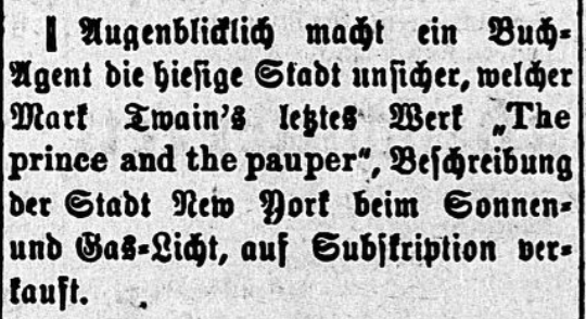| Augenblicklich macht ein Buch-Agent die hiesige Stadt unsicher, welcher Mark Twain's letztes Werk „The Prince and the pauper“, Beschreibung der Stadt New York bei Sonnen- und Gas-Licht, auf Subskription verkauft. | At the moment a book seller is making the local town unsafe. He is selling Mark Twain's last work “The Prince and the Pauper”, description of the City of New York by sunlight and gaslight [?], on subscription. |