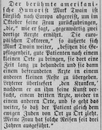 Der berühmte amerikanische Humorist Mark Twain ist kürzlich nach Europa abgereist, um im Oktober seie Frau zurückzubringen, „die,“ wie er sagt, „gegenwärtig zwei dortige Ärzte ernährt. Die europäischen Doktoren,“ so äußert sich Mark Twain weiter, „besitzen die Gepflogenheit, gute Patienten nach einem kleinen Orte zu bringen, sie dort eine Zeit lang zu behandeln und sie dann einem befreundeten Arzte in einem anderen kleinen Neste zu übergeben. Letzterer überliefert 'den Kranken,' nachdem er an ihm seine Kunst versucht, einem dritten Arzte, wieder in einem anderen Orte, und so geht das weiter, so daß der Patient gleich dem ewigen Juden von Ort zu Ort zieht. Meine Frau hat solche Reisen seit drei Jahren ausgeführt.“ The famous American humorist Mark Twain recently left for Europe to bring his wife back home in October, “who,” he says, “is supporting a couple of doctors. You see, the European doctors,” Mark Twain continues, “have the habit of bringing good patients to a small place, treating them there for a while, and then handing them over to a doctor friend in another small place. The latter, after trying his art on the patient, hands him over to a third doctor, again in another place, and so it goes on, so that the patient moves from place to place like the Wandering Jew. My wife has been making such journeys for three years.”
