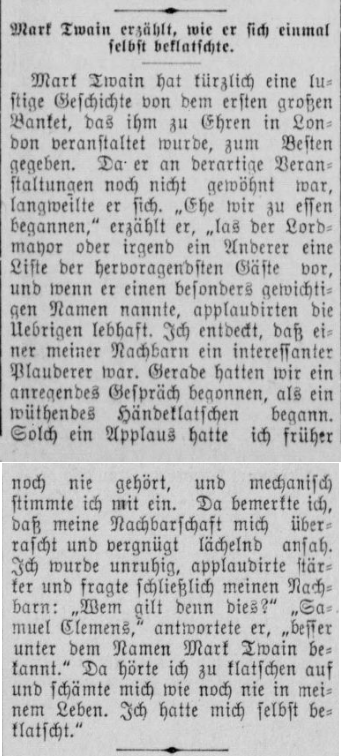 Mark Twain hat kürzlich eine lustige Geschichte von dem ersten großen Banket, das ihm zu Ehren in London veranstaltet wurde, zum Besten gegeben. Da er an derartige Veranstaltungen noch nicht gewöhnt war, langweilte er sich. „Ehe wir zu essen begannen,“ erzählt er, „las der Lordmayor oder irgend ein Anderer eine Liste der hervoragendsten Gäste vor, und wenn er einen besonders gewichtigen Namen nannte, applaudirten die Uebrigen lebhaft. Ich entdeckte, daß einer meiner Nachbarn ein interessanter Plauderer war. Gerade hatten wir ein anregendes Gespräch begonnen, als ein wüthendes Händeklatschen begann. Solch ein Applaus hatte ich früher noch nie gehört, und mechanisch stimmte ich mit ein. Da bemerkte ich, daß meine Nachbarschaft mich überrascht und vergnügt lächelnd ansah. Ich wurde unruhig, applaudirte stärker und fragte schließlich meinen Nachbarn: „Wem gilt denn dies?“ „Samuel Clemens,“ antwortete er, „besser unter dem Namen Mark Twain bekannt.“ Da hörte ich zu klatschen auf und schämte mich wie noch nie in meinem Leben. Ich hatte mich selbst beklatscht.“ Mark Twain recently told a funny story about the first big banquet held in his honor in London. Not yet accustomed to such events, he was bored. “Before we began to eat,” he says, “the Lord Mayor or someone else would read a list of the most distinguished guests, and when he mentioned a particularly weighty name, the others would applaud lively. I discovered that one of my neighbors was an interesting conversationalist. We had just begun a stimulating discussion when a furious clapping of hands began. I had never heard such applause before, and mechanically I joined in. Then I noticed that my neighbors were looking at me in surprise and smiling with amusement. I became restless, applauded harder, and finally asked my neighbor, “Whom is this for?” “Samuel Clemens,” he replied, “better known as Mark Twain.” At that point I stopped clapping and felt ashamed as I had never felt in my life. I had applauded myself.”