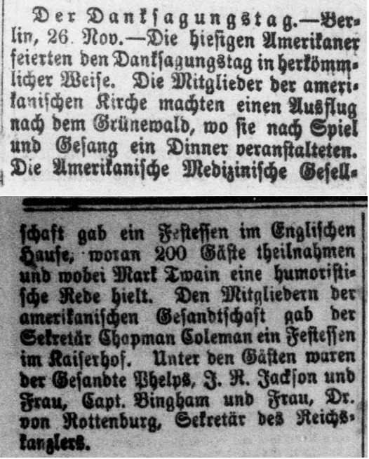| Der Danksagungstag. - Berlin, 26. Nov. - Die hiesigen Amerikaner feierten den Danksagungstag in herkömmlicher Weise. Die Mitgleider der amerikanischen Kirche machten einen Ausflug nach dem Grünewald, wo sie nach Spiel und Gesang ein Dinner veranstalteten. Die Amerikanische Medizinische Gesellschaft gab ein Festessen im Englischen Hause, woran 200 Gäste theilnahmen und wobei Mark Twain eine humoristische Rede hielt. Den Mitgliedern der amerikanischen Gesandtschaft gab der Sekretär Chapman Coleman ein Festessen im Kaiserhof. Unter den Gästen waren der Gesandte Phelps, J. R. Jackson und Frau, Capt. Bingham und Frau, Dr. von Rottenburg, Sekretär des Reichsskanzlers. | Thanksgiving Day. - Berlin, 26 Nov - The local Americans celebrated Thanksgiving Day in the traditional way. The members of the American church made an excursion to the Grünewald, where they held a dinner after games and singing. The American Medical Society held a banquet at the Englisches Haus, which was attended by 200 guests and during which Mark Twain gave a humorous speech. The members of the American legation attended a banquet at the Imperial Court organised by secretary Chapman Coleman. Among the guests were Envoy Phelps, J. R. Jackson and wife, Capt. Bingham and wife, and Dr. von Rottenburg, Secretary to the Imperial Chancellor. |