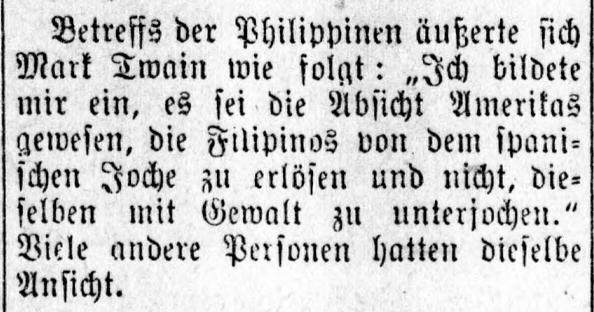 | Betreffs der Philippinen äußerte sich Mark Twain wie folgt: „Ich bildete mir ein, es sei die Absicht Amerikas gewesen, die Filipinos von dem spanischen Joche zu erlösen und nicht, die selben mit Gewalt zu unterjochen.“ Viele andere Personen hatten dieselbe Ansicht. | Concerning the Philippines, Mark Twain said: “I imagined it was the intention of America to redeem the Filipinos from the Spanish yoke, and not to subjugate the same by force.” Many other people held the same view. |