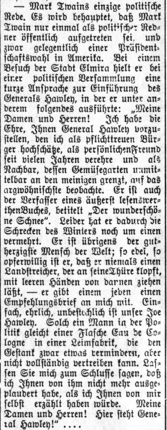 | Mark Twains einzige politische Rede. Es wird behauptet, daß Mark Twain nur einmal als politischer Redner öffentlich aufgetreten sei, und zwar gelegentlich einer Präsidentschaftswahl in Amerika. Bei einem Besuch der Stadt Elmira hielt er bei einer politischen Versammlung eine kurze Ansprache zur Einführung des Generals Hawley, in der er unter anderem folgendes ausführte: „Meine Damen und Herren! Ich habe die Ehre, Ihnen General Hawley vorzustellen, den ich als pflichttreuen Bürger hochschätze, als persönlichen Freund seit vielen Jahren verehre und als Nachbar, bessen Gemüsegarten unmittelbar an ben meinigen grenzt, auf das argwöhnischste beobachte. Er ist auch der Verfasser eines äußerst lesensweerhen Buches, betitelt „Der wunderschöne Schnee". Leider hat er dadurch die Schrecken des Winters noch um einen vermehrt. Er ist übrigens der gutherzigste Mensch der Welt; so edel, so opferwillig ist er, daß er niemals einen Landstreicher, der an seine Thüre klopft, mit leeren Hänben von dannen ziehen läßt, er gibt einem jeden einen Empfehlungsbrief an mich mit. Einfach, ehrlich, unbestechlich ist unser Joe Hawley. Solch ein Mann in der Politik gleicht einer Flasche Eau de Cologne in einer Leimfabrik, die den Gestank zwar etwas vermindern, aber nicht vollständig vertreiben kann. Lassen Sie mich zum Schlusse sagen, daß ich Ihnen von ihm nicht mehr ausgeplaudert habe, als ich Ihnen von mir selbst erzählt haben würde. Meine Damen und Herren! Hier steht General Hawley!" .... | Mark Twain's only political speech. It is claimed that Mark Twain made only one public appearance as a political speaker, and that was on the occasion of a presidential election in America. On a visit to the town of Elmira, he gave a short speech at a political meeting introducing General Hawley, in which he stated, among other things, "Ladies and gentlemen! I have the honor to introduce to you General Hawley, whom I hold in high esteem as a dutiful citizen, have honored as a personal friend of many years, and watch most suspiciously as a neighbor whose vegetable garden immediately adjoins mine. He is also the author of an extremely readable book, entitled "The Beautiful Snow". Unfortunately, he has added to the horrors of winter. By the way, he is the most kind-hearted man in the world; he is so noble, so willing to sacrifice, that he never lets a tramp who knocks on his door go away with empty hands; he gives everyone a letter of recommendation to me. Simple, honest, incorruptible is our Joe Hawley. Such a man in politics is like a bottle of eau de cologne in a glue factory, which can reduce the stench somewhat, but not dispel it completely. Let me conclude by saying that I have told you no more about him than I would have told you about myself. Ladies and gentlemen! Here is General Hawley!" .... |