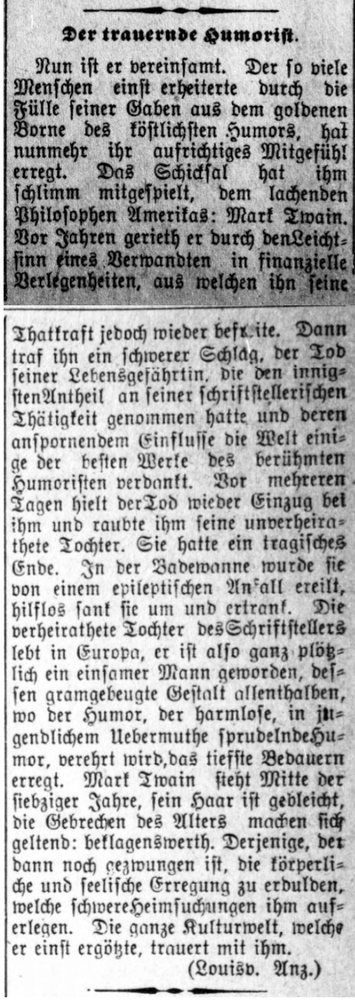 | Nun ist er vereinsamt. Der so viele Menschen einst erheiterte durch die Fülle seiner Gaben aus dem goldenen Borne des löstlichsten Humors, hat nunmehr ihr aufrichtiges Mitgefühl erregt. Das Schicksal hat ihm schlimm mitgespielt, dem lachenden Philosophen Amerikas: Mark Twain. Vor Jahren gerieth er durch den Leichtsinn eines Verwandten in finanzielle Verlegenheiten, aus welchen ihn seine Thatkraft jedoch wieder befr[e]ite. Dann traf ihn ein schwerer Schlag, der Tod seiner Lebensgefährtin, die den innigsten Antheil an seiner schriftstellerischen Thätigkeit genommen hatte und deren anspornendem Einflusse die Welt einige der besten Werke des berühmten Humoristen verdankt. Vor mehreren Tagen hielt der Tod wieder Einzug bei ihm und raubte ihm seine unverheirathete Tochter. Sie hatte ein tragisches Ende. In der Badewanne wurde sie von einem epileptischen Anfall ereilt, hilflos sank sie um und ertrank. Die verheirathete Tochter des Schriftstellers lebt in Europa, er ist also ganz plötzlich ein einsamer Mann geworden, dessen gramgebeugte Gestalt allenthalben, wo der Humor, der harmlose, in jugendlichem Uebermuthe sprudelnde Humor, verehrt wird, das tiefste Bedauern erregt. Mark Twain steht Mitte der siebziger Jahre, sein Haar ist gebleicht, die Gebrechen des Alters machen sich geltend: beklagenswerth. Derjenige, der dann noch gezwungen ist, die körperliche und seelische Erregung zu erdulden, welche schwere Heimsuchungen ihm auferlegen. Die ganze Kulturwelt, welche er einst ergötzte, trauert mit ihm. | He is lonely now. He who once cheered up so many people with the abundance of his gifts from the golden well of the most delicious humor, has now aroused their sincere sympathy. Fate has played a cruel game with him, the laughing philosopher of America: Mark Twain. Years ago, he got into financial difficulties due to the carelessness of a relative, from which, however, his strength of action freed him again. Then he was struck by a heavy blow, the death of his wife, who been intimately involved in his literary activity and to whose inspiring influence the world owes some of the best works of the famous humorist. Several days ago, death came to him again and robbed him of his unmarried daughter. She met a tragic end. She was overcome by an epileptic seizure in the bathtub, where she helplessly sank down and drowned. The writer's married daughter lives in Europe, so he suddenly became a lonely man, whose bent figure arouses the deepest sympathy everywhere where humor, the harmless humor that bubbles up in youthful exuberance, is revered. Mark Twain is in his mid-seventies, his hair is whitened, the infirmities of old age are making themselves felt: pitiful. He who is still forced to endure the physical and mental agitation which heavy tribulations impose upon him. The whole cultural world, which he once delighted, mourns with him. |