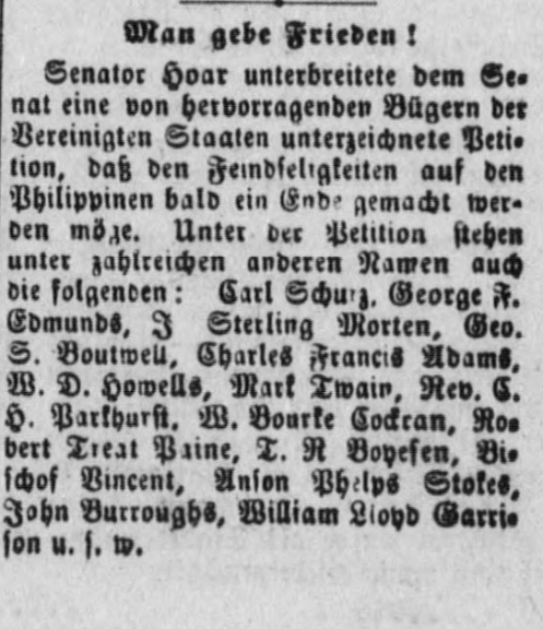 | Senator Hoar unterbreitete dem Senat eine von hervorragenden Bürgern der Vereinigten Staaten unterzeichnete Petition, daß den Feindseligkeiten auf den Philippinen bald ein Ende gemacht werden möge. Unter der Petition stehen unter zahlreichen anderen Namen auch die folgenden: Carl Schurz, George F. Edmunds, J. Sterling Morten, Gev. S. Boutwell, Charles Francis Adams, W. D. Howells, Mark Twain, Rev. C. H. Parkhurst, W. Bourke Cockran, Robert Treat Paine, T. R. Boyesen, Bischof Vincent, Anton Phelps Stokes, John Burroughs, William Lloyd Garrison u.s.w. | Senator Hoar presented to the Senate a petition signed by distinguished citizens of the United States that hostilities in the Philippines be soon brought to an end. The petition is signed with the following names, among numerous others: Carl Schurz, George F. Edmunds, J. Sterling Morten, Gev. S. Boutwell, Charles Francis Adams, W. D. Howells, Mark Twain, Rev. C. H. Parkhurst, W. Bourke Cockran, Robert Treat Paine, T. R. Boyesen, Bishop Vincent, Anton Phelps Stokes, John Burroughs, William Lloyd Garrison, and others. |
