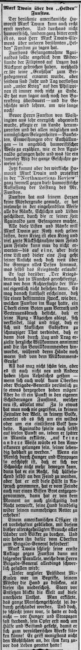 Der berühmte amerikanische Humorist Mark Twain kann auch recht ernst werden. Und durchaus nicht humoristisch, sondern ganz bitter ernst ist es, was Herr Mark Twain-Clemens über unseren berühmten „Helden“ Funston zu sagen hat. The famous American humorist Mark Twain can also be quite serious. And by no means humorous, but quite sincere is what Mr. Mark Twain-Clemens has to say about our famous “hero” Funston.