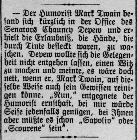 | Der Humorist Mark Twain befand sich kürzlich in der Office des Senators Chauncy Depew und erhielt die Erlaubniß, die Hände, die durch Tinte befleckt waren, zu waschen. Depew wollte sich die Gelegenheit nicht entgehen lassen, einen Witz zu machen und meinte, es wäre doch nett, wenn er, Mark Twain, auf dieselbe Weise auch sein Gewissen reinigen könne. „Nun,“ entgegnete der Humorist ernsthaft, bei mir würde Seife jedenfalls genügen, bei Ihnen aber müßte es schon „Sapolio“ oder „Scourene“ sein. | The humorist Mark Twain recently found himself in the office of Senator Chauncy Depew and was given permission to wash his hands, which were stained by ink. Depew did not want to miss the opportunity to make a joke and said that it would be nice if he, Mark Twain, could also cleanse his conscience in the same way. “Well,” replied the humorist earnestly, “soap would be sufficient for me, but for you it would have to be “Sapolio” or “Scourene”. |