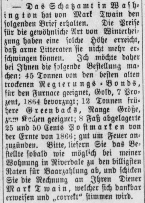 | Das Schatzamt in Washington hat von Mark Twain den folgenden Brief erhalten. Die Preise für die gewöhnliche Art von Winterheizung haben eine solche Höhe erreicht, daß arme Litteraten sie nicht mehr erschwingen können. Ich möchte daher bei Ihnen die folgende Bestellung machen: 45 Tonnen von den besten alten trockenen Regierungs-Bonds, für den Furnace geeignet, Gold, 7 Prozent, 1864 bevorzugt; 12 Tonnen frühere Greenbacks, Range Größe, zum Kochen geeignet; 8 Faß abgelagerte 25 und 50 Cents Postmarken von der Ernte von 1866; gut um Feuer anzuzünden. Bitte, liefern Sie das Bestellte sobald wie möglich bei meiner Wohnung in Riverdale zu den billigsten Raten für Barzahlung ab, und schicken Sie die Rechnung an Ihren Diener Mark Twain, welcher sich dankbar erweisen und „correkt“ stimmen wird. | {The Treasury Department in Washington received the following letter from Mark Twain.} Prices for the customary kinds of Winter fuel having reached the altitude which puts them out of the reach of literary persons in straitened circumstances, I desire to place with you the following order: Forty-five tons best old ⟪dry⟫ government bonds, suitable for furnace, gold 7 per cents, 1864, preferred. Twelve tons early greenbacks, range size, suitable for cooking. Eight barrels seasoned 25 and 50 cent postal currency, vintage of 1866, eligible for kindlings. Please deliver with all convenient dispatch at my house in Riverdale at lowest rates for spot cash, and send bill to your obliged servant. Mark Twain, who will be very grateful and will vote right.” |