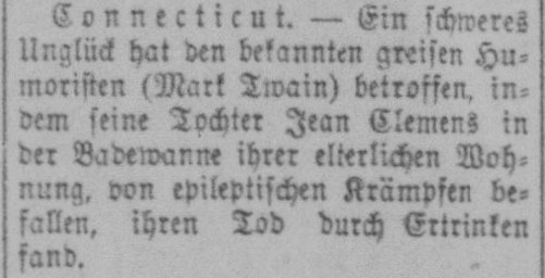 | Connecticut. - Ein schweres Unglück hat den bekannten greisen Humoristen (Mark Twain) betroffen, indem seine Tochter Jean Clemens in der Badewanne ihrer elterlichen Wohnung, von epileptischen Krämpfen befallen, ihren Tod durch Ertrinken fand. | Connecticut. - A serious misfortune has befallen the well-known aged humorist (Mark Twain): His daughter Jean Clemens died, stricken by epileptic convulsions, drowning in the bathtub of her parents' home. |