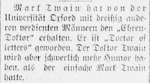 | Mark Twain hat von der Universität Oxford mit dreißig anderen verdienten Männern den „Ehren-Doktor“ erhalten. Er ist „Doctor of Letters“ geworden. Der Doktor Twain wird aber schwerlich mehr Humor haben als der einfache Mark Twain hatte. | Mark Twain along with thirty other deserving men has been awarded an honorary doctorate by Oxford University. He has become a “Doctor of Letters”. However, Twain the doctor will hardly have more of a sense of humor than the simple Mark Twain did. |