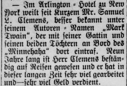 | Im Arlington-Hotel zu New York weilt seit Kurzem Mr. Samuel L. Clemens, besser bekannt unter seinem Autoren-Namen „Mark Twain“, der mit seiner Gattin und seinen beiden Töchtern an Bord des „Minnehaha“ dort eintraf. Neun Jahre lang ist Herr Clemens beständig auf Reisen gewesen und er hat in dieser langen Zeit sehr viel gearbeitet und - sehr viel Geld verdient. | Mr. Samuel L. Clemens, better known by his pen name “Mark Twain”, has recently been staying at the Arlington Hotel in New York, where he arrived with his wife and two daughters [Clara And Jean] on board the “Minnehaha”. For nine years, Mr. Clemens had been traveling constantly, and during this long time he has worked very hard and - earned a lot of money. |