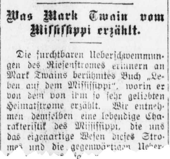| Die furchtbaren Ueberschwemmungen des Riesenstromes erinnern an Mark Twains berühmtes Buch „Leben auf dem Mississippi“, worin er von dem von ihm so sehr geliebten Heimatstrome erzählt. Wir entnehmen demselben eine lebendige Charakteristik des Mississippi, die uns das eigenartige Wesen dieses Stromes und die gegenwärtigen Ueberschwemmungsgefahren in ihren bedenklichen Wirkungen deutlich veranschaulicht. | {The terrible floods of the giant river bring to mind Mark Twain's famous book “Life on the Mississippi”, in which he writes of the river he loved so much. The book provides a vivid characterization of the Mississippi, which clearly illustrates the peculiar nature of this river and the present danger of flooding in their alarming effects.} |