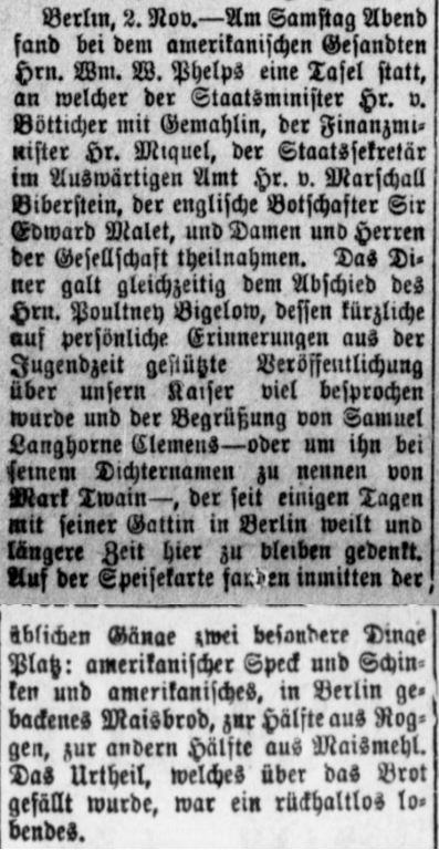| Berlin, 2. Nov. - Am Samstag Abend fand bei dem amerikanischen Gesandten Hrn. Wm. W. Phelps eine Tafel statt, an welcher der Staatsminister Hr. v. Botticher mit Gemahlin, der Finanzminister Hr. Miquel, der Staatssekretär im Auswärtigen Amt Hr. v. Marschall Biberstein, der englische Botschafter Sir Edward Malet, und Damen und Herren der Gesellschaft theilnahmen. Das Diner galt gleichzeitig dem Abschied des Hrn. Poultney Bigelow, dessen kürzliche auf persönliche Erinnerungen aus der Jugendzeit gestützte Veröffentlichung über unsern Kaiser viel besprochen wurde und der Begrüßung von Samuel Langhorne Clemens - oder um ihn bei seinem Dichternamen zu nennen von Mark Twain -, der seit einigen Tagen mit seiner Gattin in Berlin weilt und längere Zeit hier zu bleiben gedenkt. Auf der Speisekarte fa[nd]en inmitten der üblichen Gänge zwei besondere Dinge Platz: amerikanischer Speck und Schinken und amerikanisches, in Berlin gebackenes Maisbrod, zur Hälfte aus Roggen, zur andern Hälfte aus Maismehl. Das Urtheil, welches über das Brot gefällt wurde, war ein rückhaltlos lobendes. | Berlin, Nov. 2 - On Saturday evening a dinner was held at the home of the American envoy, Mr. Wm. W. Phelps, which was attended by the Minister of State, Mr. v. Bötticher and his wife, the Minister of Finance, Mr. Miquel, the Secretary of State at the Foreign Office, Mr. v. Marschall Biberstein, the English Ambassador, Sir Edward Malet, and ladies and gentlemen of the social scene. The dinner was also dedicated to the farewell of Mr. Poultney Bigelow, whose recent publication about our Emperor, based on personal memories from his youth, was much discussed, and to the welcome of Samuel Langhorne Clemens - or to call him by his pen name, Mark Twain - who has been in Berlin with his wife for a few days and intends to stay here for a long time. On the menu, in the midst of the usual courses, there were two special items: American bacon and ham, and American cornbread, baked in Berlin, half of it made of rye, the other half of cornmeal. The verdict that was passed on the bread was one of unreserved praise. |