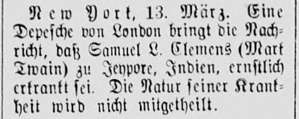 | New York, 13. März. Eine Depeche von London bringt die Nachricht, daß Samuel L. Clemens (Mark Twain) zu Jeypore, Indien, ernstlich erkrankt sei. Die Natur seiner Krankheit wird nicht mitgetheilt. | New York, March 13. A dispatch from London brings the news that Samuel L. Clemens (Mark Twain) is taken seriously ill at Jaipur, India. The nature of his illness is not disclosed. |