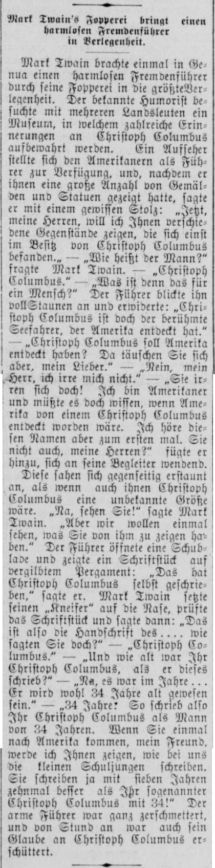Mark Twain brachte einmal in Genua einen harmlosen Fremdenführer durch seine Fopperei in die größteVerlegenheit [sic]. Der bekannte Humorist besuchte mit mehreren Landsleuten ein Museum, in welchem zahlreiche Erinnerungen an Christoph Columbus aufbewahrt werden. Ein Aufseher stellte sich den Amerikanern als Führer zur Verfügung, und, nachdem er ihnen eine große Anzahl von Gemälden und Statuen gezeigt hatte, sagte er mit einem gewissen Stolz: „Jetzt, meine Herren, will ich Ihnen verschiedene Gegenstände zeigen, die sich einst im Besitz von Christoph Columbus befanden.“ - „Wie heißt der Mann?“ fragte Mark Twain. - „Christoph Columbus.“ - „Was ist denn das für ein Mensch?“ Der Führer blickte ihn vollStaunen [sic] an und erwiderte: „Christoph Columbus ist doch der berühmte Seefahrer, der Amerika entdeckt hat.“ - „Christoph Columbus soll Amerika entdeckt haben? Da täuschen Sie sich aber, mein Lieber.“ - „Nein, mein Herr, ich irre mich nicht.“ - „Sie irren sich doch! Ich bin Amerikaner und müßte es doch wissen, wenn Amerika von einem Christoph Columbus entdeckt worden wäre. Ich höre diesen Namen aber zum ersten mal. Sie nicht auch, meine Herren?“ fügte er hinzu, sich an seine Begleiter wendend. Diese sahen sich gegenseitig erstaunt an, als wenn auch ihnen Christoph Columbus eine unbekannte Größe wäre. „Na, sehen Sie!“ sagte Mark Twain. „Aber wir wollen einmal sehen, was Sie von ihm zu zeigen haben.“ Der Führer öffnete eine Schublade und zeigte ein Schriftstück auf vergilbtem Pergament: „Das hat Christoph Columbus selbst geschrieben,“ sagte er. Mark Twain setzte seinen „Kneifer“ auf die Nase, prüfte das Schriftstück und sagte dann: „Das ist also die Handschrift des .... wie sagten Sie doch?“ - „Christoph Columbus.“ - „Und wie alt war Ihr Christoph Columbus, als er dieses schrieb?“ - „Na, es war im Jahre ... Er wird wohl 34 Jahre alt gewesen sein.“ - „34 Jahre! So schrieb also Ihr Christoph Columbus als Mann von 34 Jahren. Wenn Sie einmal nach Amerika kommen, mein Freund, werde ich Ihnen zeigen, wie bei uns die kleinen Schuljungen schreiben. Sie schreiben ja mit sieben Jahren zehnmal besser als Ihr sogenannter Christoph Columbus mit 34!“ Der arme Führer war ganz zerschmettert, und von Stund an war auch sein Glaube an Christoph Columbus erschüttert. Mark Twain once embarrassed a harmless tour guide in Genoa with a joke. The well-known humorist and several compatriots visited a museum, in which numerous memorabilia of Christopher Columbus are kept. An attendant placed himself at the disposal of the Americans as a guide, and, after showing them a large number of paintings and statues, said with a certain pride, “Now, gentlemen, I want to show you various objects which were once in the possession of Christopher Columbus.” - “What is the man's name?” asked Mark Twain. - “Christopher Columbus.” - “What sort of person is he?” The guide looked at him astonished and replied, “Christopher Columbus is the famous navigator who discovered America.” - “Christopher Columbus is supposed to have discovered America? You are certainly mistaken there, my dear fellow.” - “No, sir, I am not mistaken.” - “You are mistaken! I am an American and should know if America was discovered by some Christopher Columbus. But this is the first time I have heard this name. How about you, gentlemen?” he added, turning to his companions. They looked at each other in amazement, as if Christopher Columbus was entirely unknown to them as well. “See!” said Mark Twain. “But let's look at what you have to show of him.” The guide opened a drawer and showed a document on yellowed parchment: “Christopher Columbus wrote this himself,” he said. Mark Twain put his pince-nez on his nose, examined the writing style, and then said, “So this is the handwriting of .... who did you say it was?” - “Christopher Columbus.” - “And how old was your Christopher Columbus when he wrote this?” - “Well, it was in the year ... He must have been 34 years old.” - “34 years! So that's how your Christopher Columbus wrote as a man of 34. If you ever come to America, my friend, I will show you how the little schoolboys write there. They write ten times better at the age of seven than your so-called Christopher Columbus at 34!” The poor guide was completely devastated, and from that moment on his faith in Christopher Columbus was shaken as well.