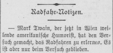 | Mark Twain, der jetzt in Wien weilende amerikanische Humorist, hat den Versuch gemacht, das Radfahren zu erlernen. Es ist aber nur beim Versuch geblieben. | Mark Twain, the American humorist now staying in Vienna, made an attempt to learn how to ride a bicycle. But it remained an attempt only. |
