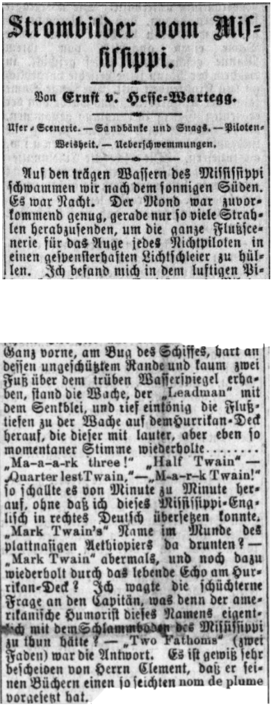 | „Ma-a-a-rk three!“ „Half Twain“ - „Quarter lest Twain,“ - „M-a-r-k Twain!“ so schallte es von Minute zu Minute herauf, ohne daß ich dieses Mississippi-Englisch in rechtes Deutsch übersetzten konnte, „Mark Twain's“ Name im Munde des plattnasigen Aethiopiers da drunten? - &dquo;Mark Twain“ abermals, und noch dazu wiederholt durch das lebende Echo am Hurrikan-Deck? Ich wagte die schüchterne Frage an den Capitän, was denn der amerikanische Humorist dieses Namens eigentlich mit dem Schlammboden des Mississippi zu thun hätte? - „Two Fathoms“ (zwei Faden) war die Antwort. Es ist gewiß sehr bescheiden von Herrn Clement [sic], daß er seinen Büchern einen so seichten nom de plume vorgesetzt hat. | “Ma-a-a-rk three!” “Half Twain” - “Quarter lest Twain,” - “M-a-r-k Twain!” it resounded ever minute, without my being able to translate this Mississippi English into proper German, “Mark Twain's” name in the mouth of the flat-nosed Ethiopian down there? - “Mark Twain” again, and repeated even by the living echo on the hurricane deck? I dared to ask the captain timidly what the American humorist of that name had to do with the muddy bottom of the Mississippi? - “Two Fathoms” was the answer. It is certainly very modest of Mr. Clement [sic] that he has put such a shallow nom de plume before his books. |